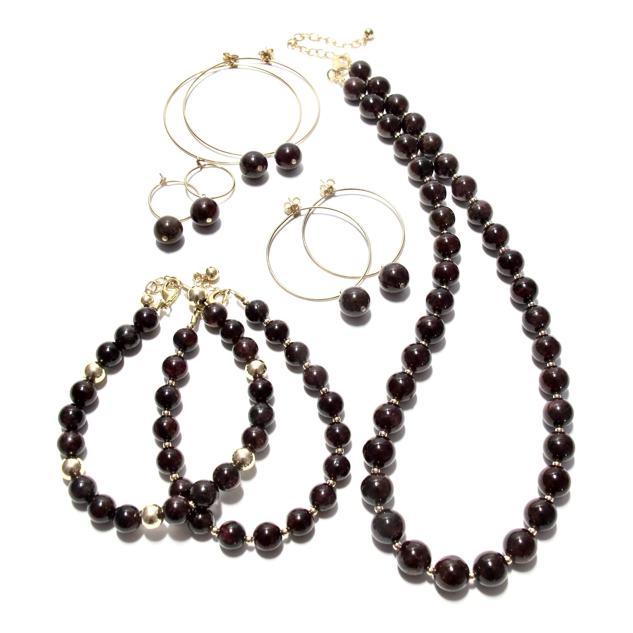 small 15mm gold filled hoops with single garnet beads.