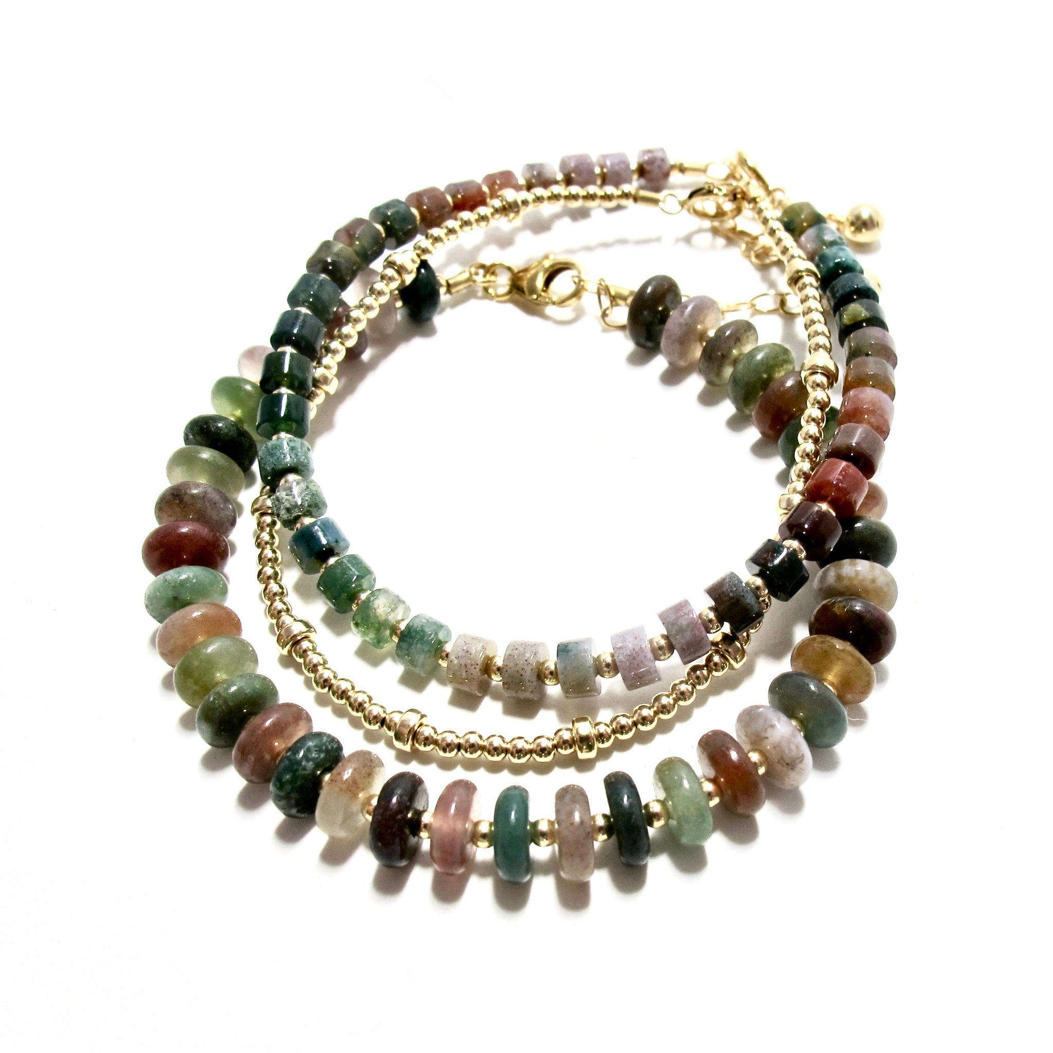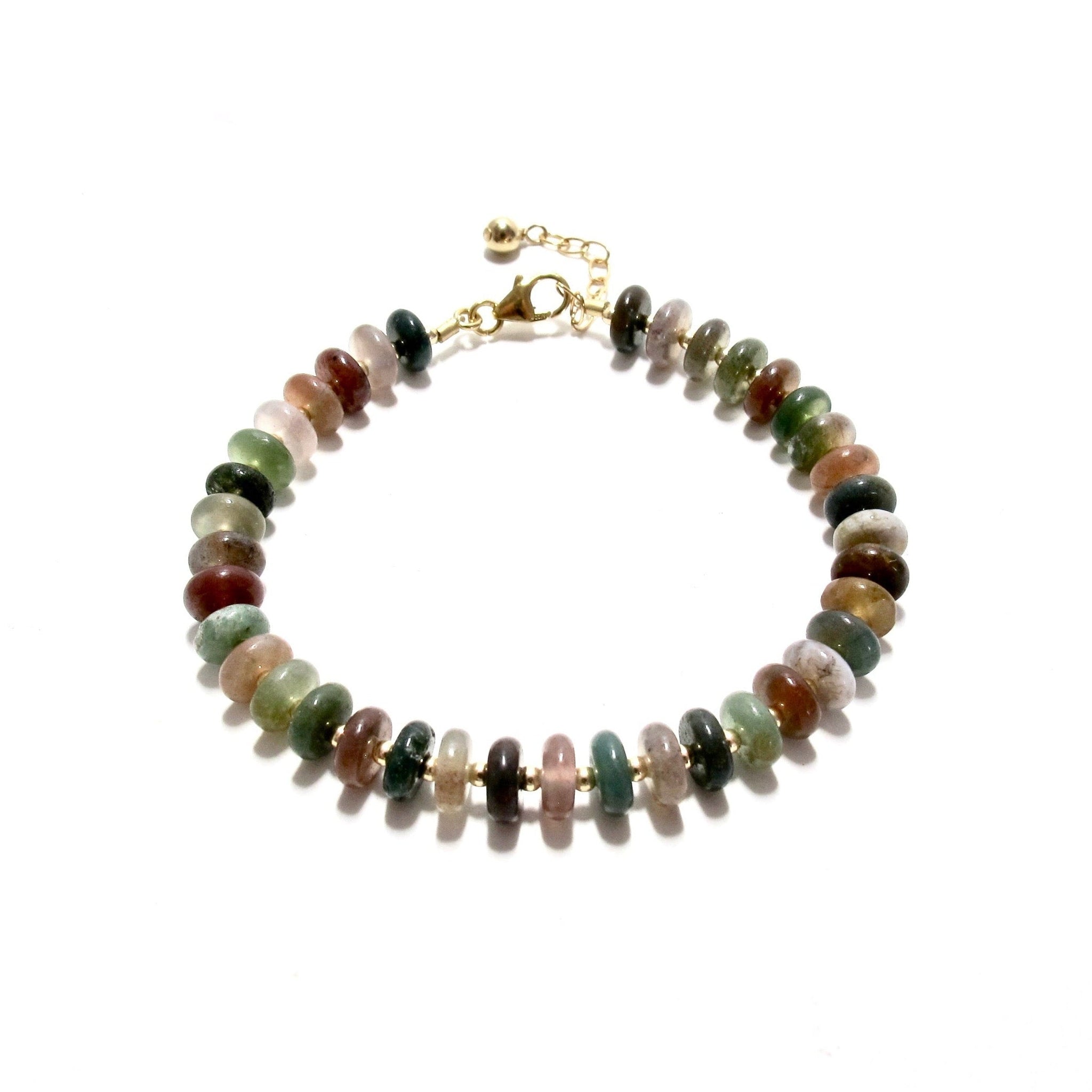 Rich earthy mixed colours of Indian agate, dotted with gold filled beads and a gold filled adjuster chain, giving a choice of lengths from 17-19cm.