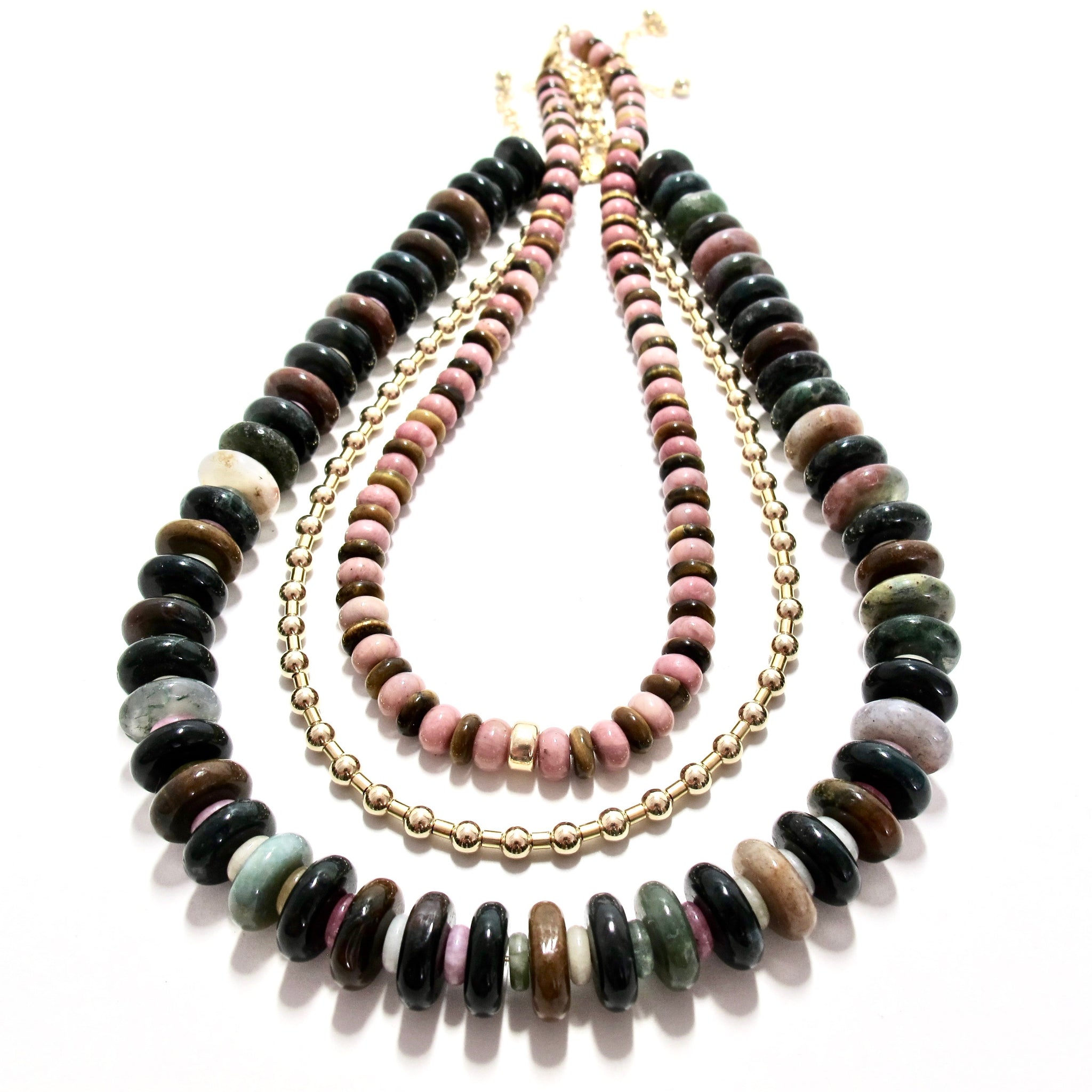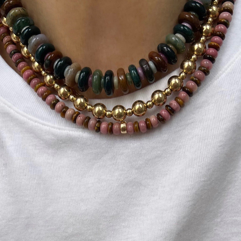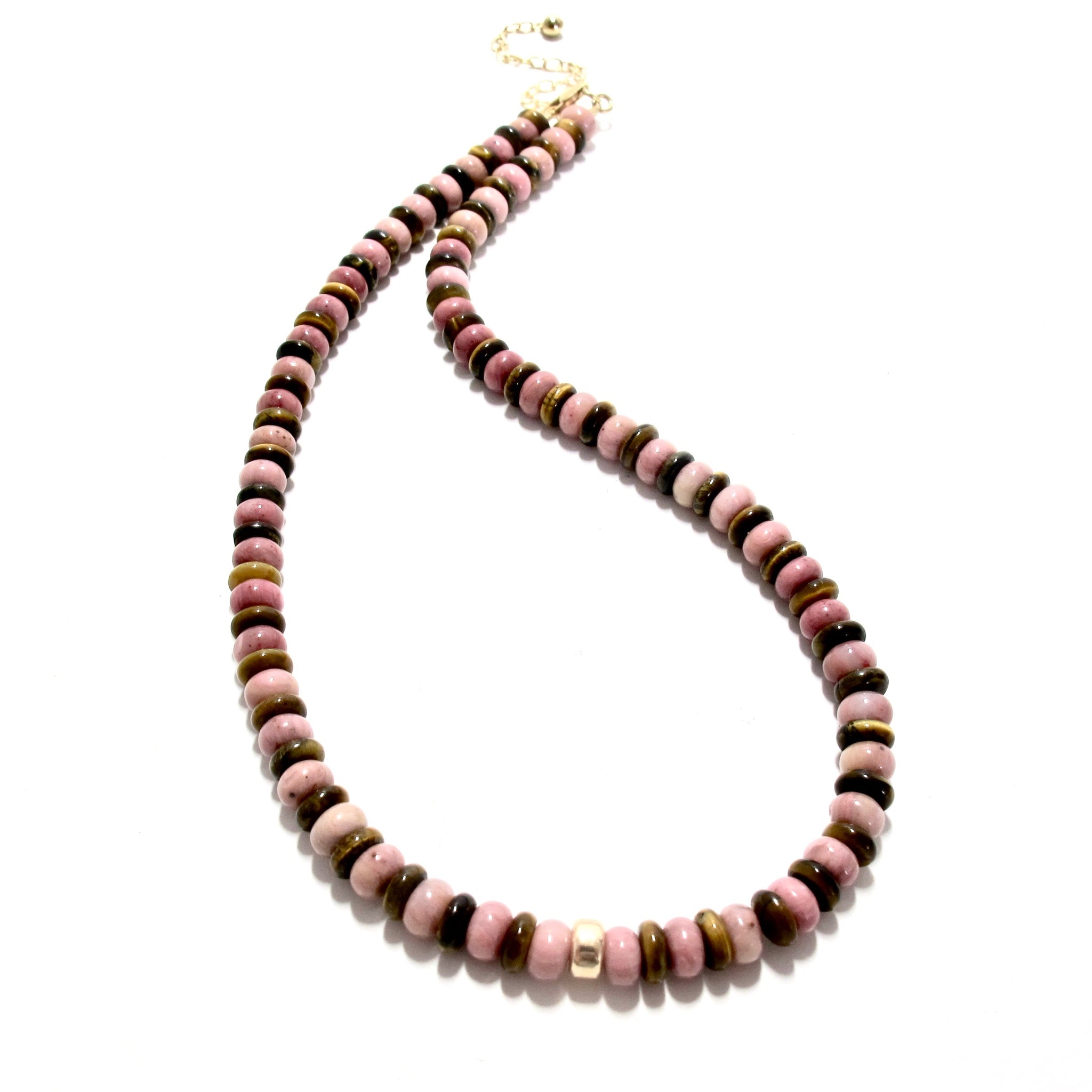 alternating 6mm pink rhodonite & tigers eye beads with a central gold filled bead and a gold filled adjuster chain giving the necklace a choice of lengths, up to 45cm.