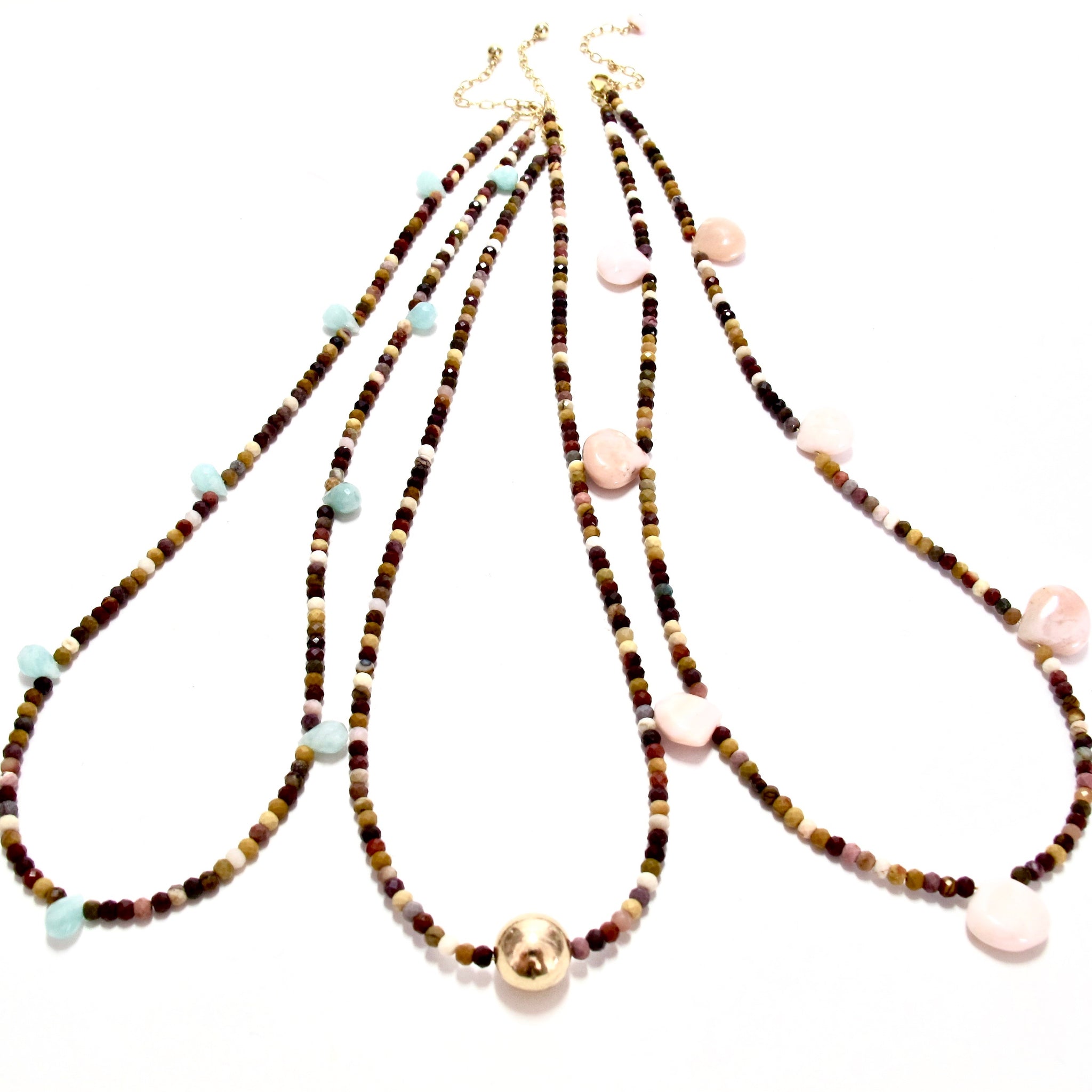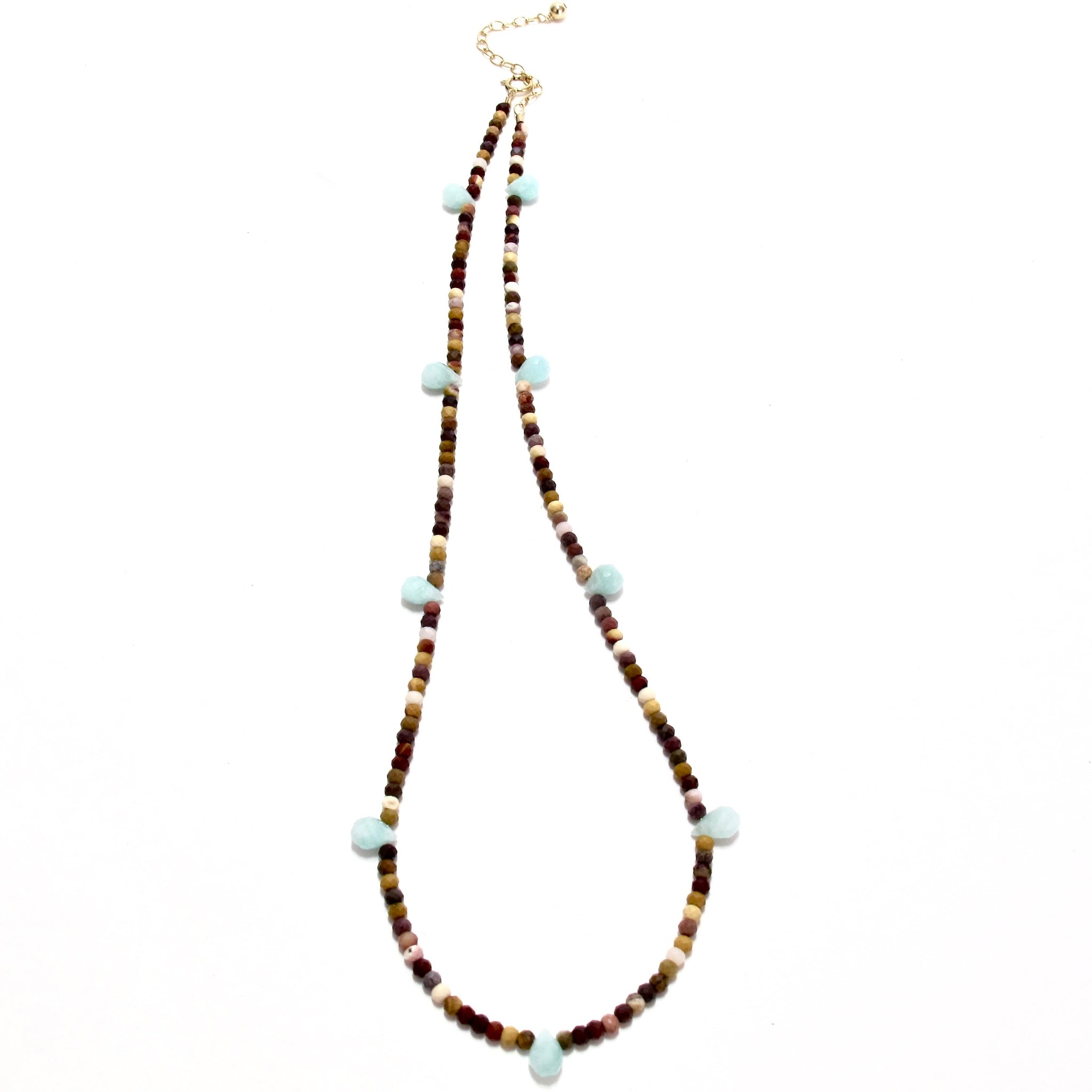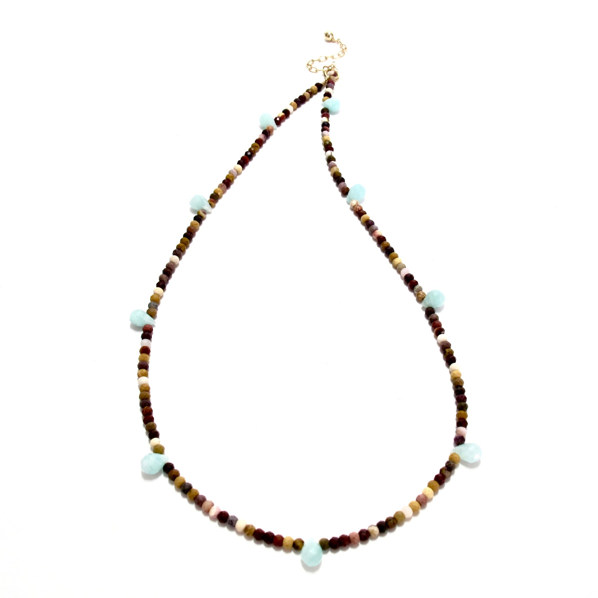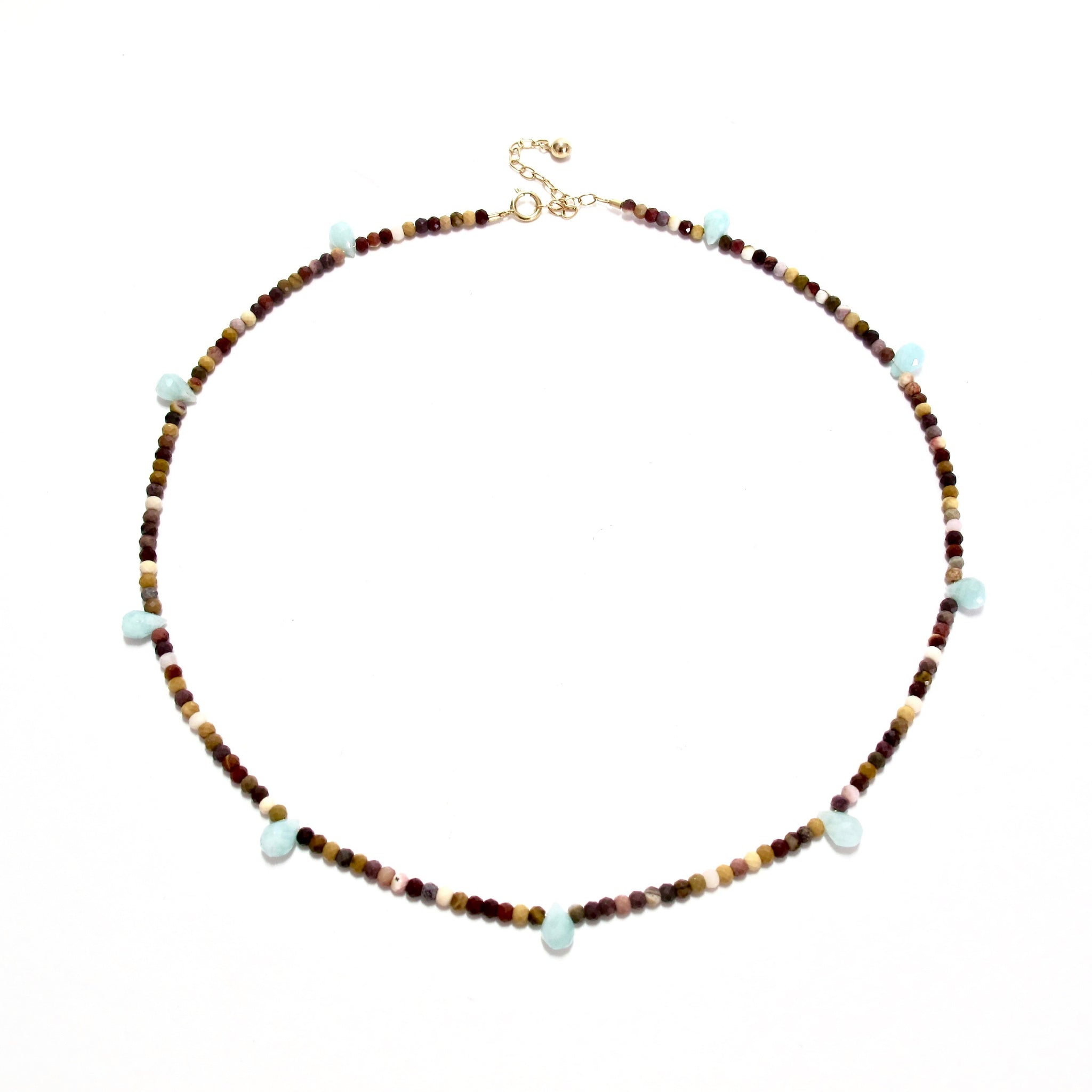 tiny faceted mixed coloured mookaite beads dotted with amazonite drops, with a gold filled adjuster chain, giving a choice of lengths from 39-45cm