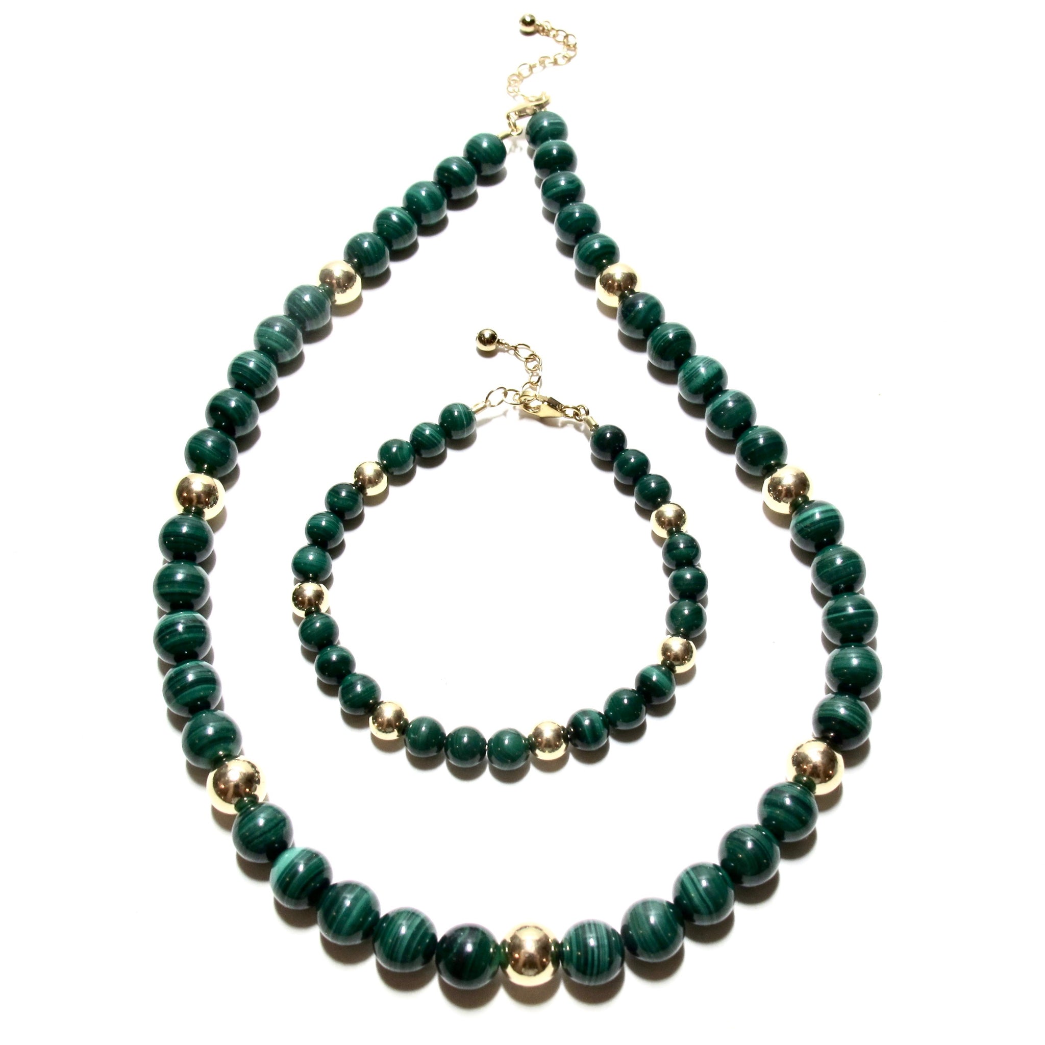 Smooth round 8mm malachite and gold filled beads, with an adjuster chain giving a choice of lengths up to 45cm. See also the malachite bracelets.